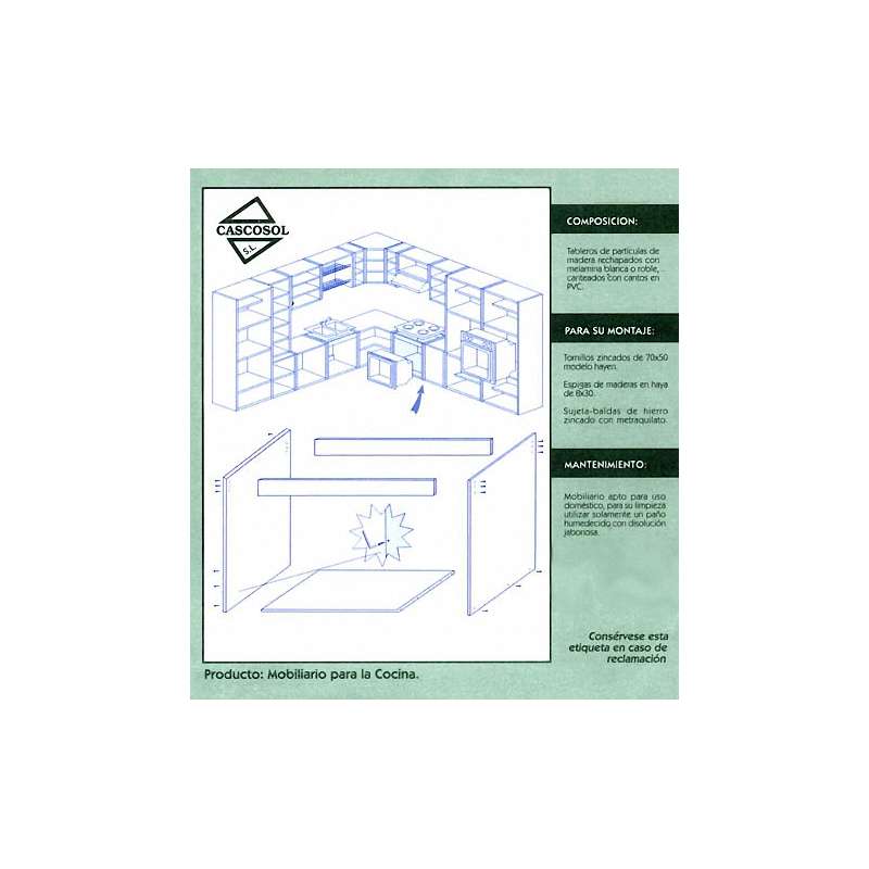 El módulo de cocina se presenta en kit , embalado en pack retractilado que incluye todos los elementos del mueble: los herrajes necesarios para su ensamblaje, tapones decorativos y una etiqueta identificativa del producto.