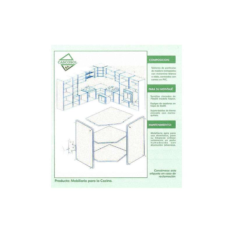 El módulo de cocina se presenta en kit , embalado en pack retractilado que incluye todos los elementos del mueble: los herrajes necesarios para su ensamblaje, tapones decorativos y una etiqueta identificativa del producto.