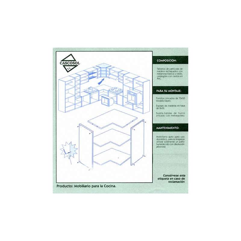 El módulo de cocina se presenta en kit , embalado en pack retractilado que incluye todos los elementos del mueble: los herrajes necesarios para su ensamblaje, tapones decorativos y una etiqueta identificativa del producto.