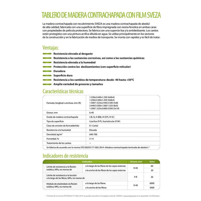 Tablero contrachapado a base de abedul de alta calidad, con una capa con acabado antideslizante y otra con acabado liso. Ambas superficies están impregnadas con una película protectora a base de resina fenólica. Cantos recubiertos de acrílico para añadirles resistencia. Ideal para construcción de viviendas y de medios de transporte.