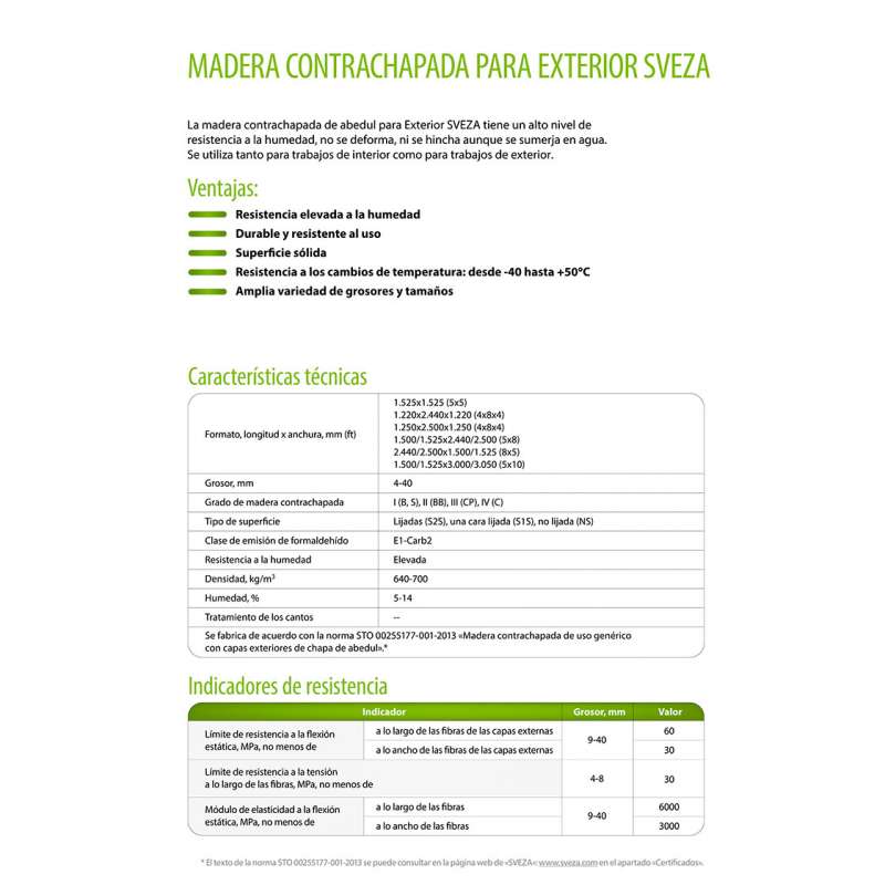 Tablero contrachapado de abedul con una altísima resistencia a la humedad. Excelente para usos exteriores. No se hincha incluso estando sumergido en agua. Perfecto para usos estructurales, en interiores y exteriores.
